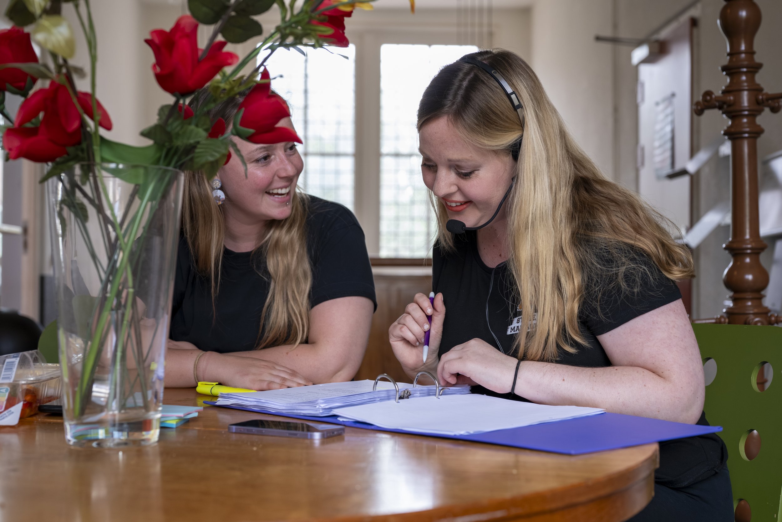 Learning from the best: First-time Stage Manager Amy Nelson (right) receiving mentorship and technical guidance from veteran SM Ellen Brooker (left) as they prepare the prompt book for opening night.