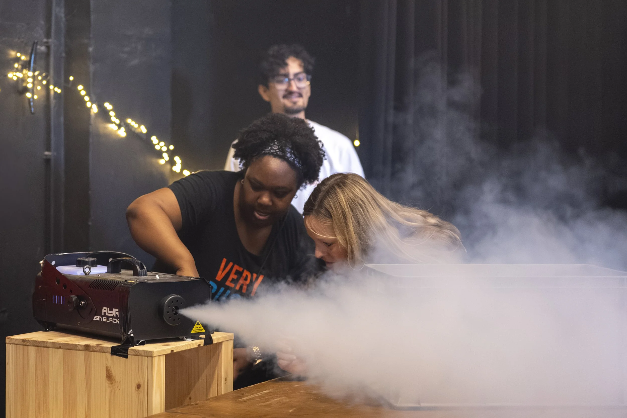 Pictured: Shiro Mungai, Amy Nelson, and Mateo Abrahami de Melverda figuring out the smoke machine